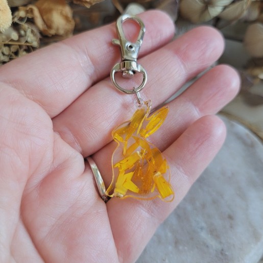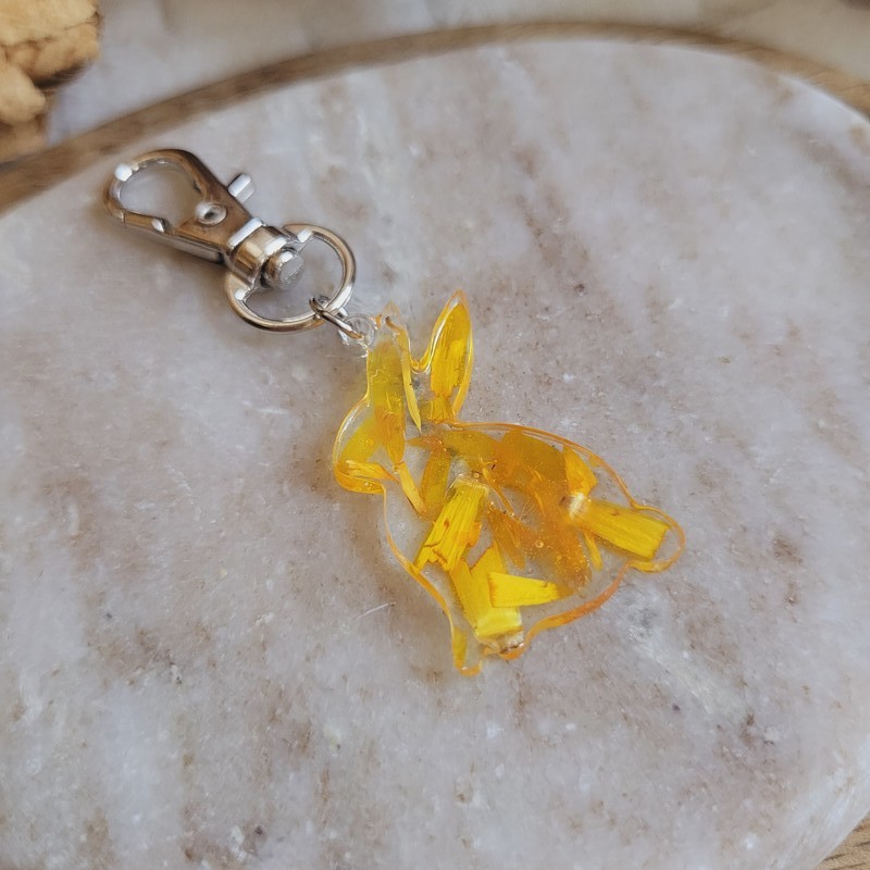 Apportez une touche printanière et poétique à vos accessoires avec ce porte-clés lapin en résine orné de fleurs séchées naturelles d'Immortelle, imaginé pour la collection de Pâques.