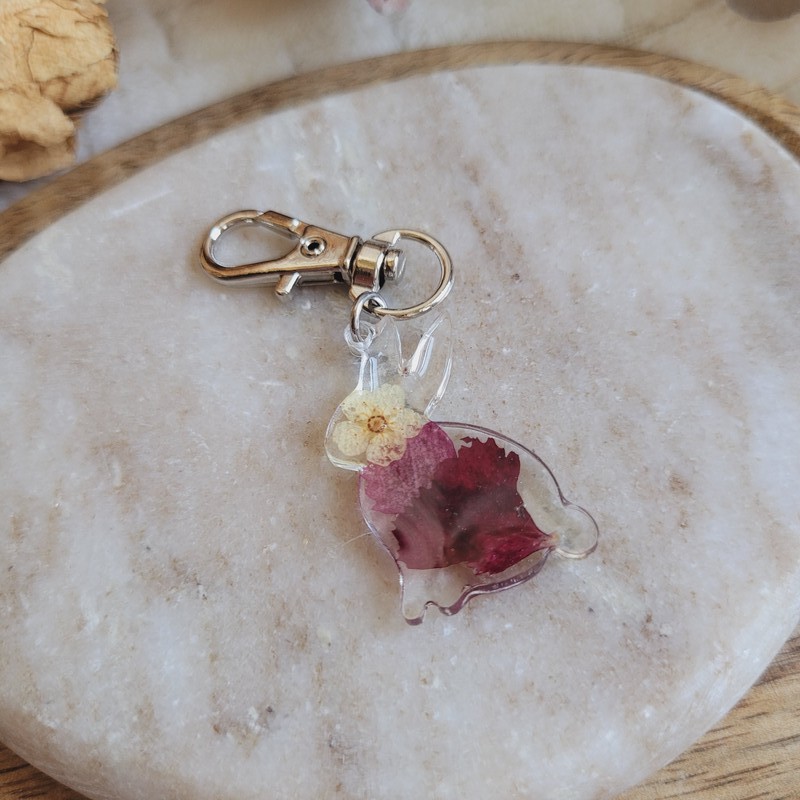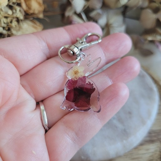 Apportez une touche printanière et poétique à vos accessoires avec ce porte-clés lapin en résine orné de fleurs séchées naturelles d'Oeillet de Poète, imaginé pour la collection de Pâques.