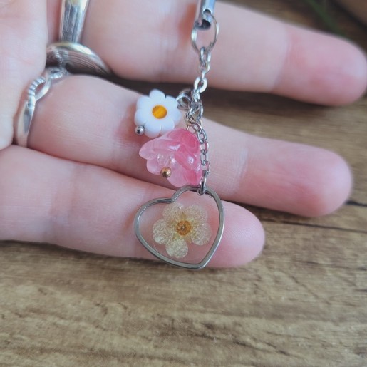 • un pendentif coeur (1.5 cm) renfermant une véritable fleur de Spirée séchée, cueillie dans le jardin,
