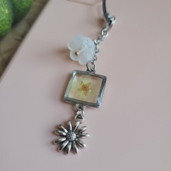 • un pendentif carré (1.3 cm) renfermant une véritable fleur de Spirée séchée, cueillie dans le jardin,