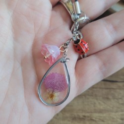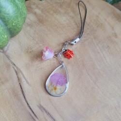 • un pendentif cadre goutte (1.5 x 2.5 cm) renfermant une véritable fleur d'Oeillet de Poète et Spirée séchée, cueillie dans le jardin,