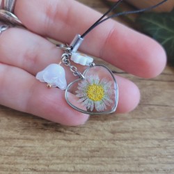 • un pendentif cadre coeur (2 cm) renfermant une véritable fleur de Pâquerette séchée, cueillie dans le jardin,