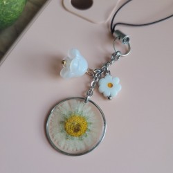 • un pendentif cadre rond (2 cm) renfermant une véritable fleur de Pâquerette séchée, cueillie dans le jardin,