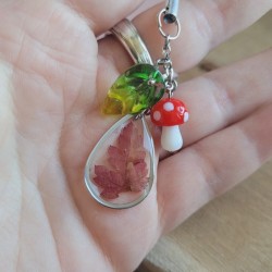 • un pendentif cadre goutte (2.5 x 1.7 cm) renfermant une véritable feuille séchée de Géranium Herbe à Robert, cueillie dans le jardin,