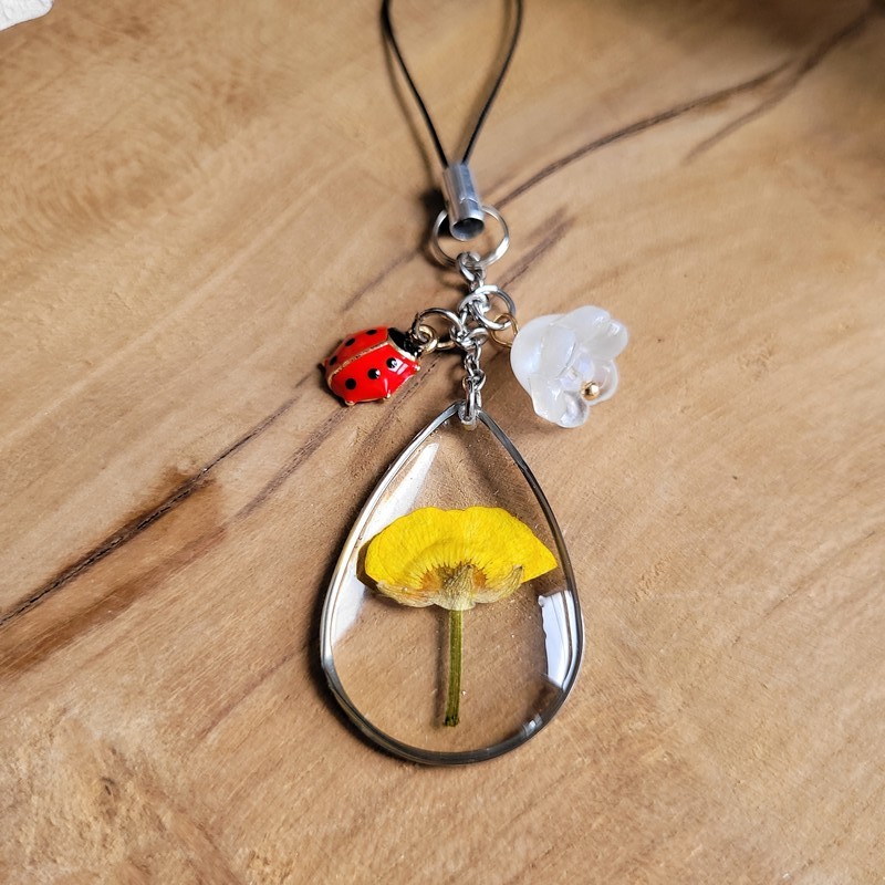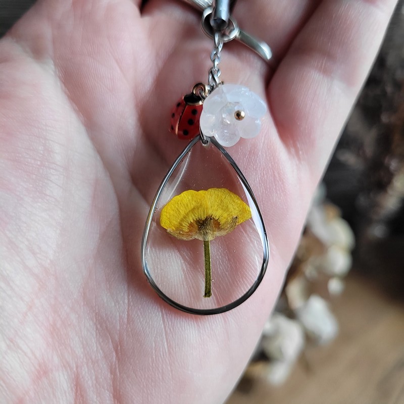 • un pendentif cadre goutte (3.2 x 2.2 cm) renfermant une véritable fleur de Bouton d'Or séchée, cueillie dans le jardin,