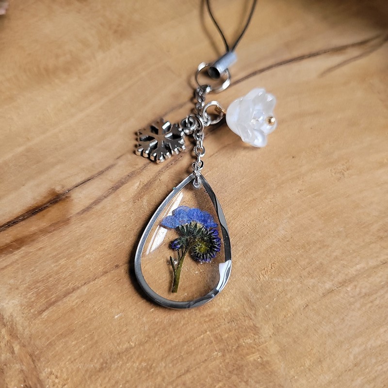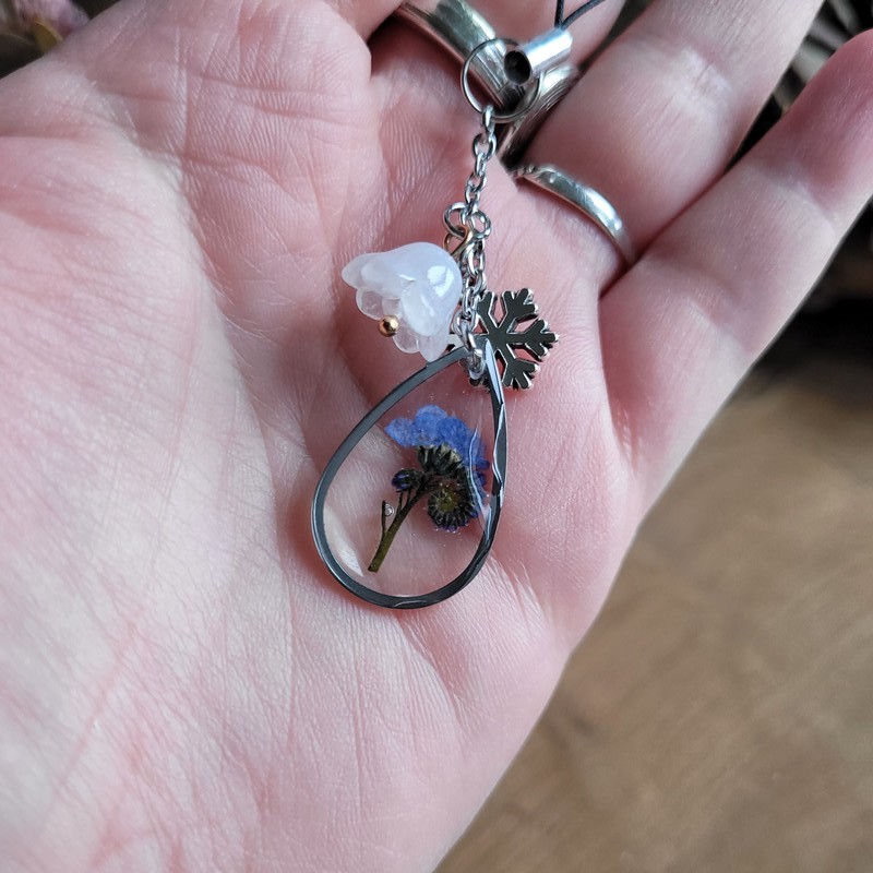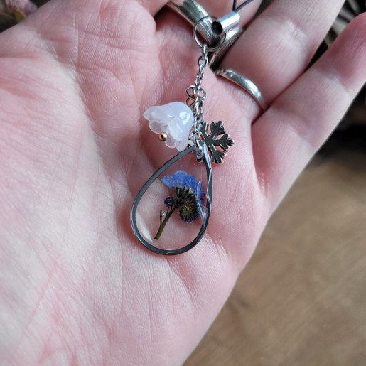 • un pendentif cadre goutte (2.5 x 1.5 cm) renfermant une véritable fleur de Myosotis séchée, cueillie dans le jardin,