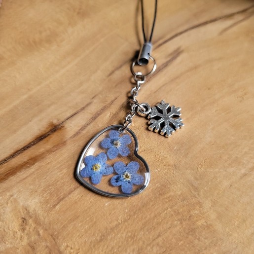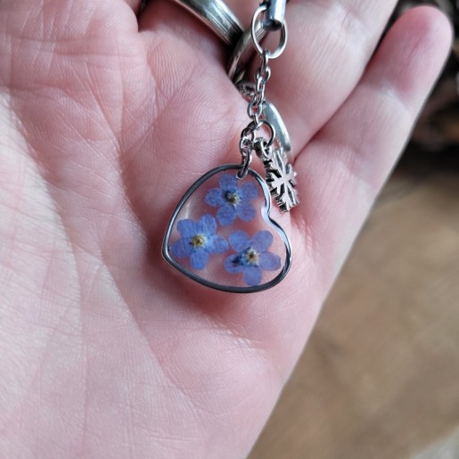 • un pendentif cadre coeur (2 cm) renfermant une véritable fleur de Myosotis séchée, cueillie dans le jardin,