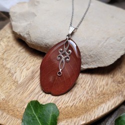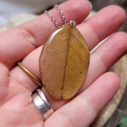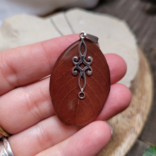 Ce pendentif est un bijou artisanal fragile : il s’agit d’une véritable feuille cristallisée.
