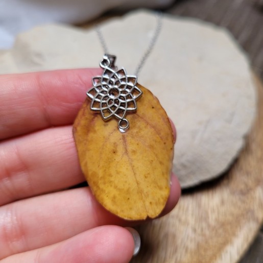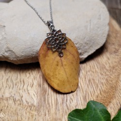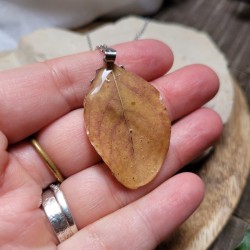 Ce pendentif est un bijou artisanal fragile : il s’agit d’une véritable feuille cristallisée.