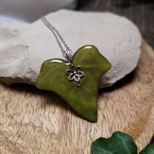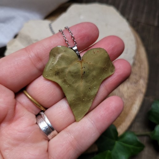 Apportez une touche de nature et d’élégance à vos tenues avec ce pendentif en feuille de Lierre cristallisée dans la résine.