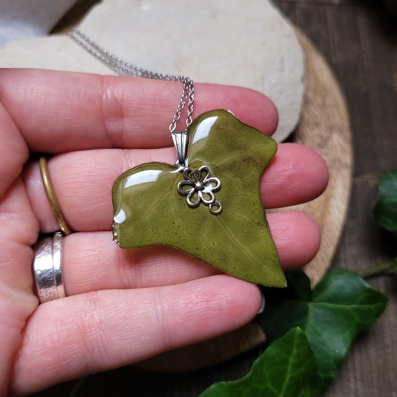 Pendentif feuille de Lierre cristallisée en résine – bijou végétal artisanal 🌿