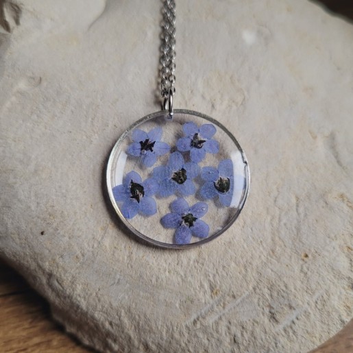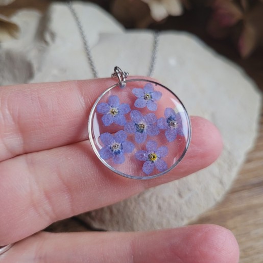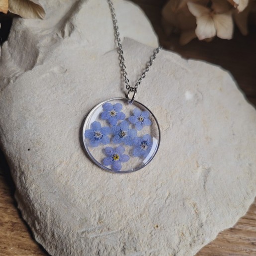Ce bijou unique met en valeur une fleur de Myosotis, soigneusement cultivée, récoltée et séchée dans mon jardin.