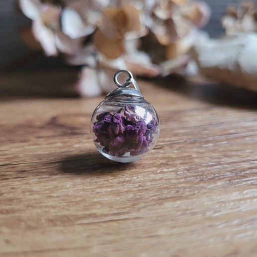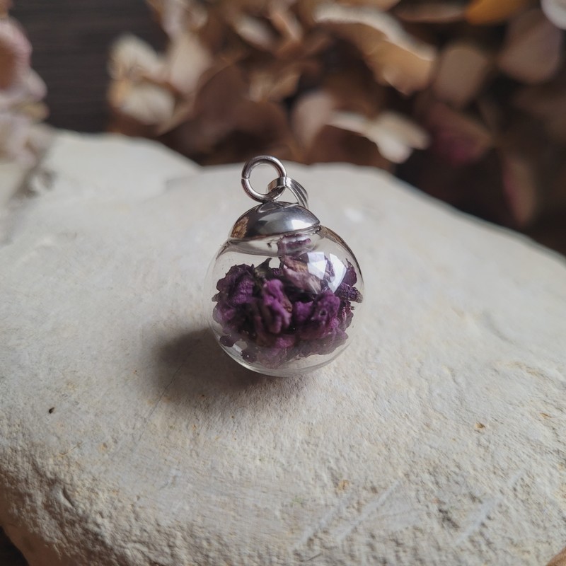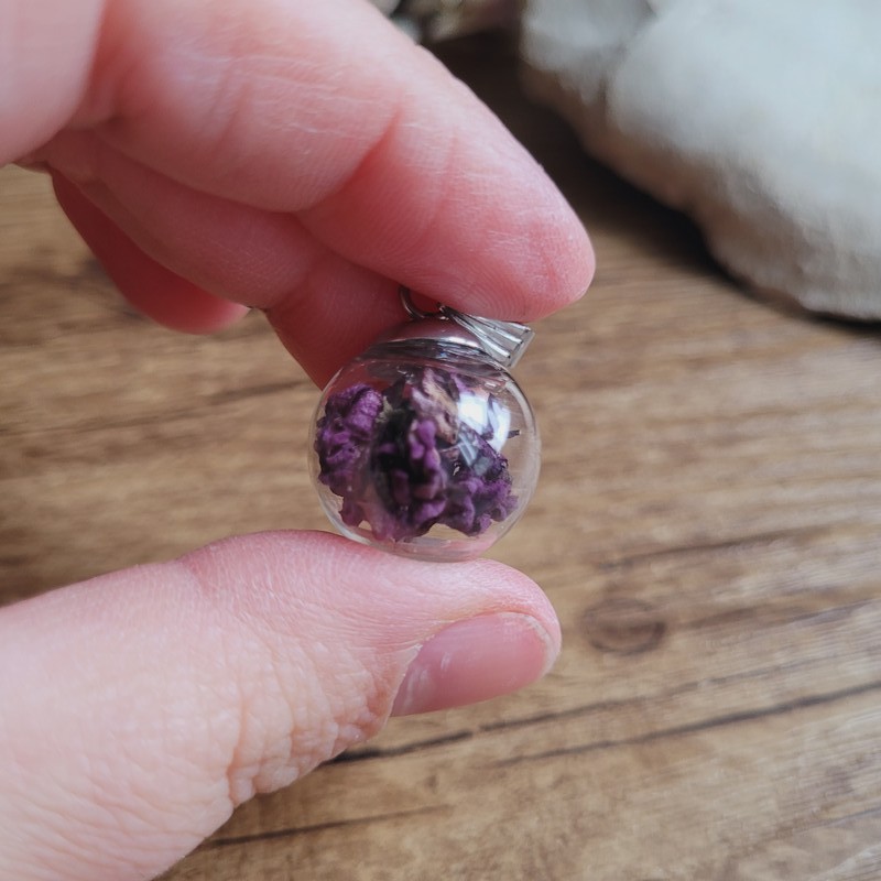 Chaque pendentif est rempli de fleurs séchées, soigneusement cultivées, récoltées, et séchées dans notre jardin.