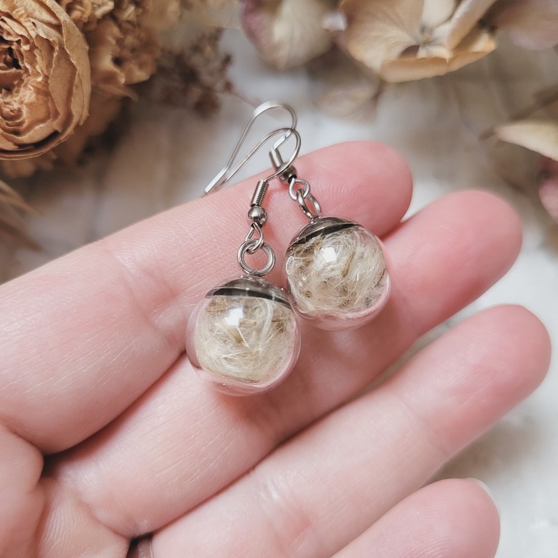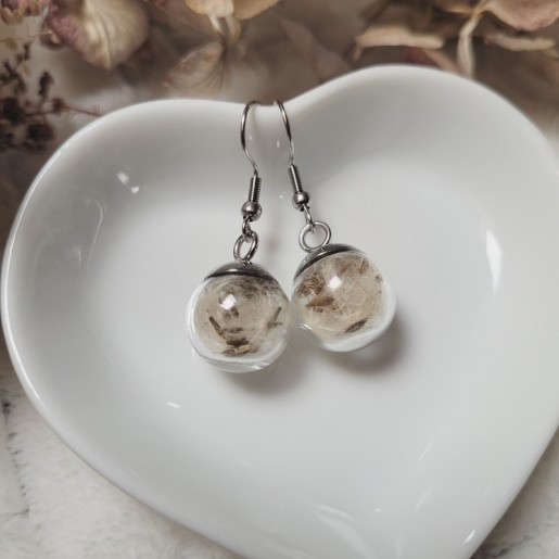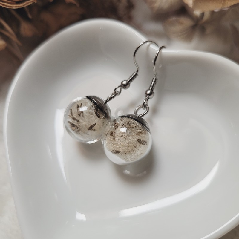 Chaque sphère en verre, d'un diamètre de 1.2 cm, renferme des fleurs séchées de Pissenlit soigneusement cultivées dans mon jardin et séchées artisanalement.