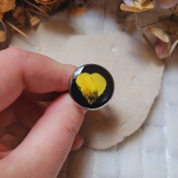 Le design délicat de cette bague est rehaussé d’un plateau rond de 2 cm de diamètre, dans lequel des pétales de bouton d’or, soigneusement séchés et issus de mon propre jardin, sont intégrés à la main dans un fond de résine noire. L’ensemble est protégé et sublimé par une couche de résine transparente qui met en valeur les fleurs naturelles tout en leur conférant une brillance éclatante.