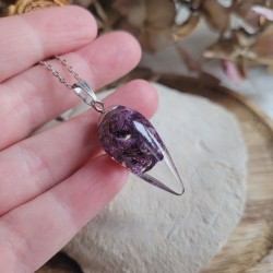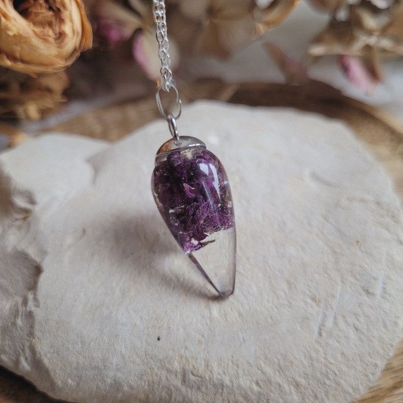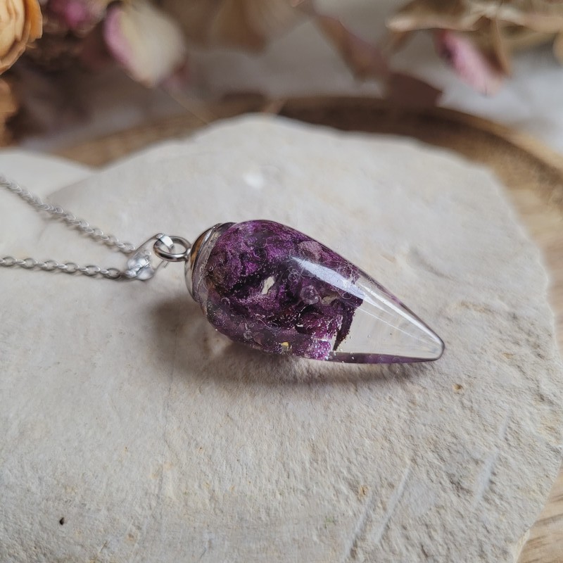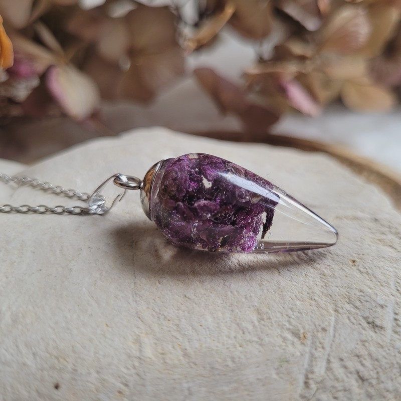 Chaque pendentif est rempli de fleurs séchées, soigneusement cultivées, récoltées, et séchées dans notre jardin.