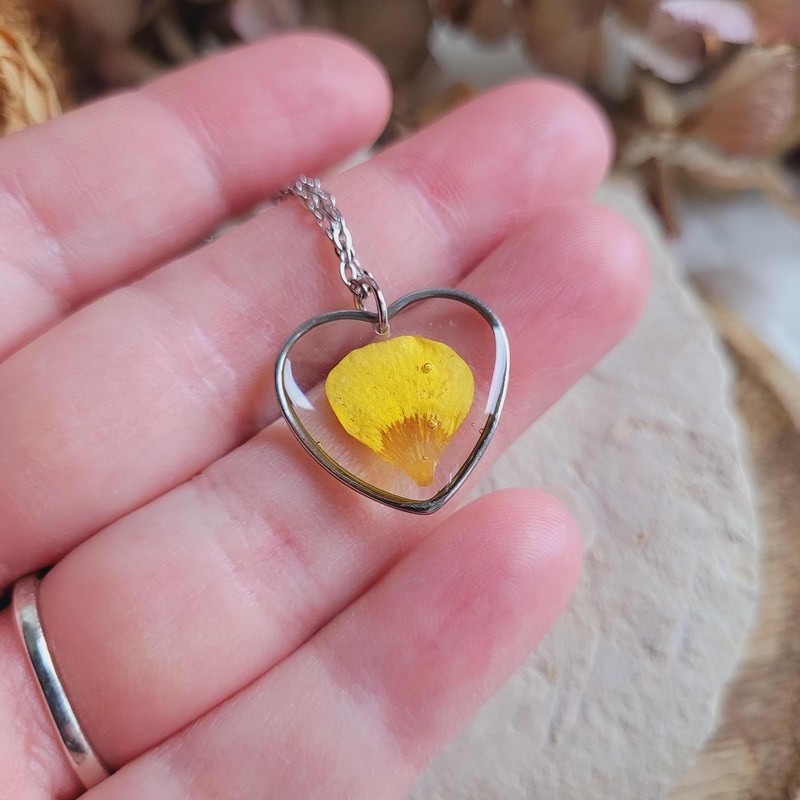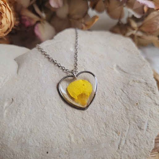 Sublimez votre style avec ce pendentif artisanal en forme de coeur, réalisé à la main avec des fleurs séchées naturelles.