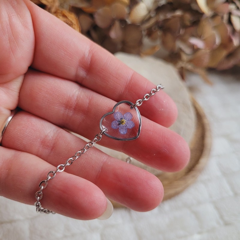• Pendentif : Pendentif coeur en acier inoxydable (1.5 x 1.5 cm) avec inclusion d'une fleur séchée de Myosotis provenant de mon jardin et séchée par mes soins.