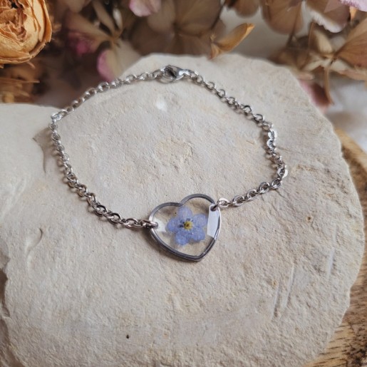 Ajoutez une touche unique à votre style avec ce bracelet en acier inoxydable, sublimé par une fleur séchée de Myosotis.