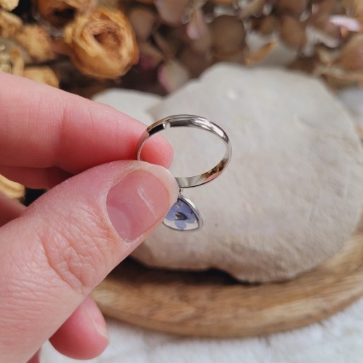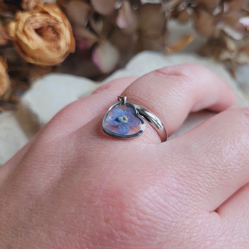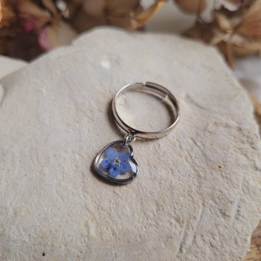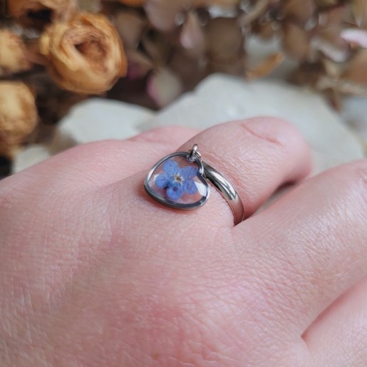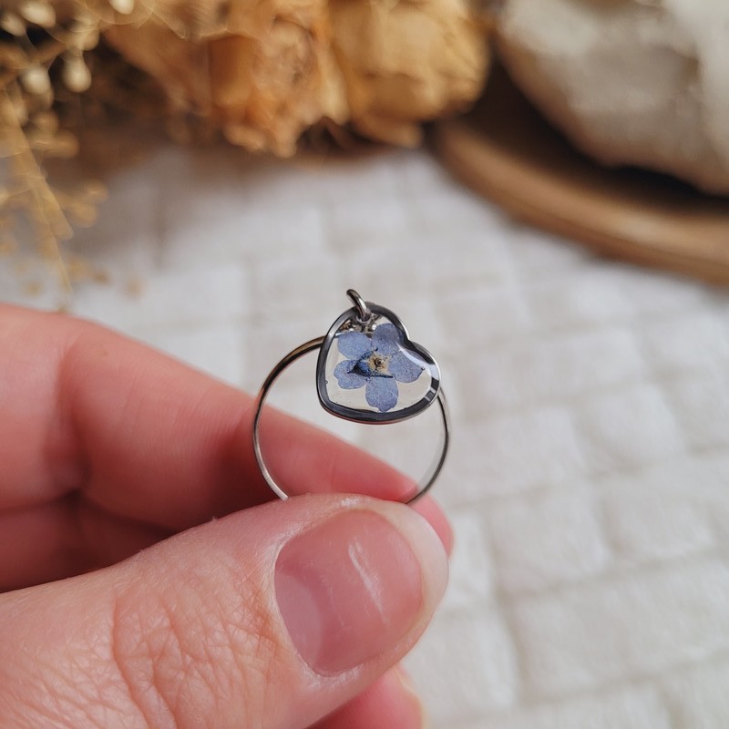Le design délicat de cette bague est agrémentée d’un pendentif coeur de 1 cm, dans lequel une fleur de Myosotis, soigneusement séchée et issue de mon propre jardin, est intégrée à la main dans un fond de résine.