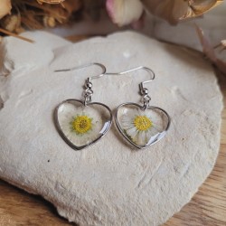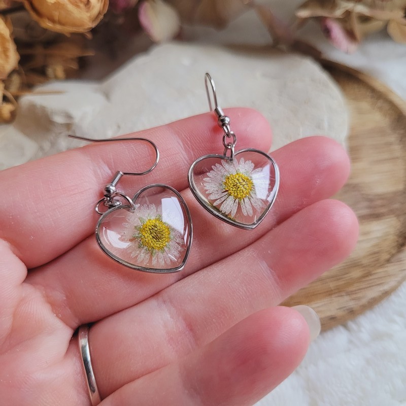 Sublimez votre style avec ces boucles d'oreilles en acier inoxydable, orné de pendentifs coeurs en résine transparente et de véritables fleurs séchées artisanales.