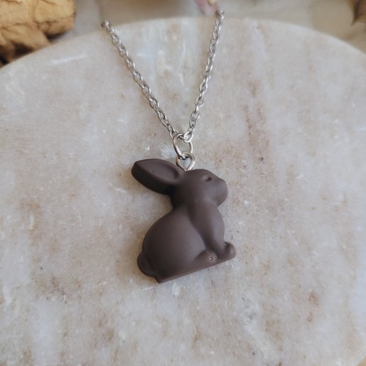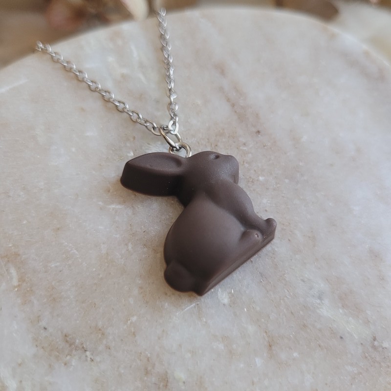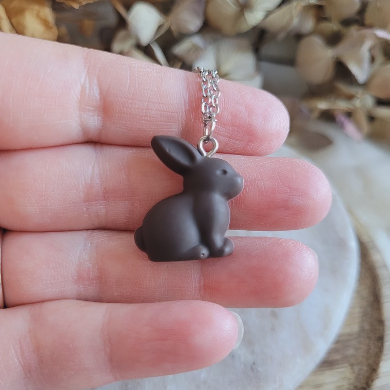 Craquez pour ce pendentif mini lapin en chocolat noir en résine, une création gourmande et originale imaginée pour la collection de Pâques.