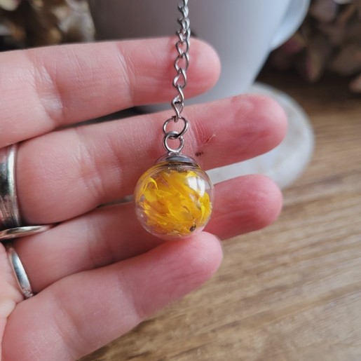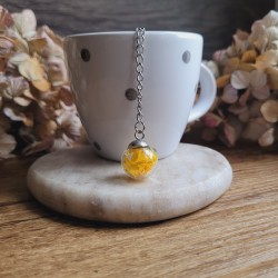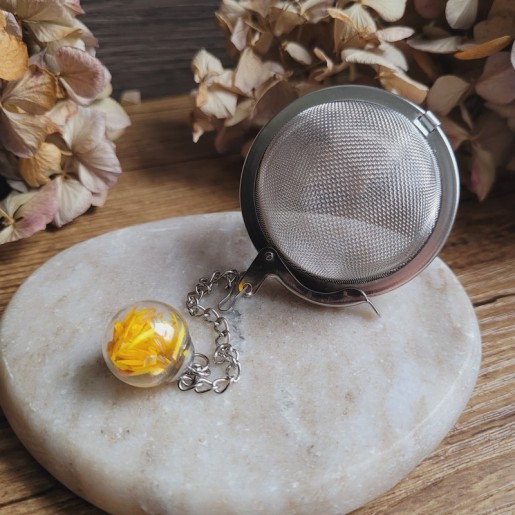 Savourez votre thé avec élégance grâce à notre boule à thé en acier inoxydable ornée d'un pendentif sphère en verre unique et fleurs séchées d'Immortelle jaunes.