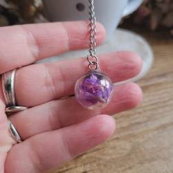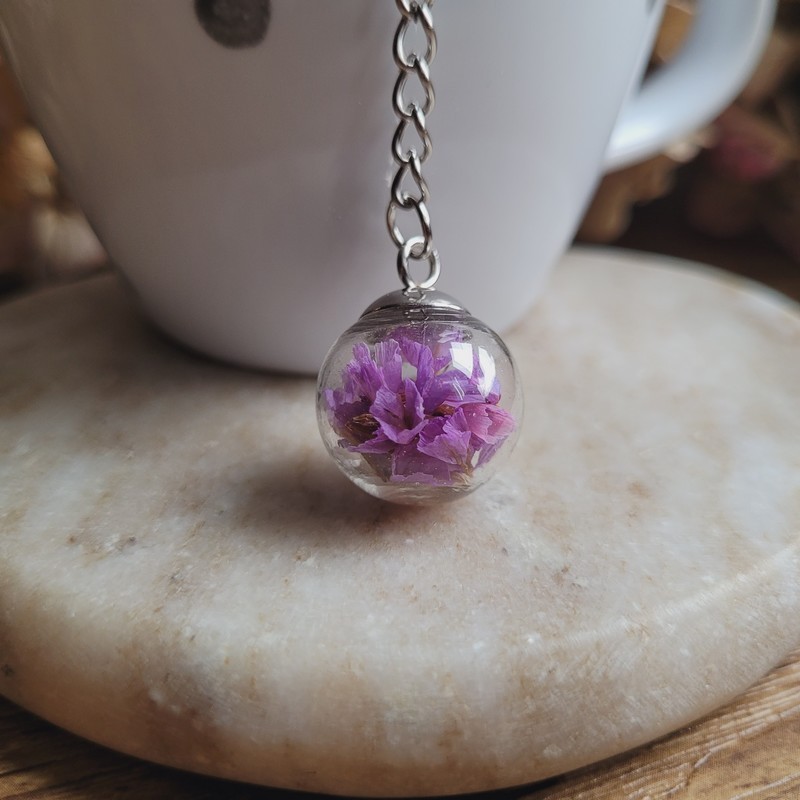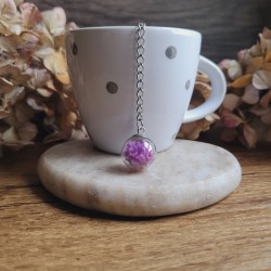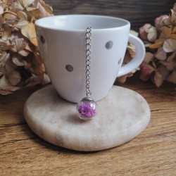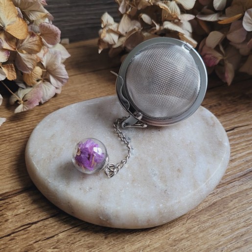 Savourez votre thé avec élégance grâce à notre boule à thé en acier inoxydable ornée d'un pendentif sphère en verre unique et fleurs séchées d'Immortelle rose.