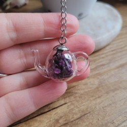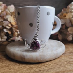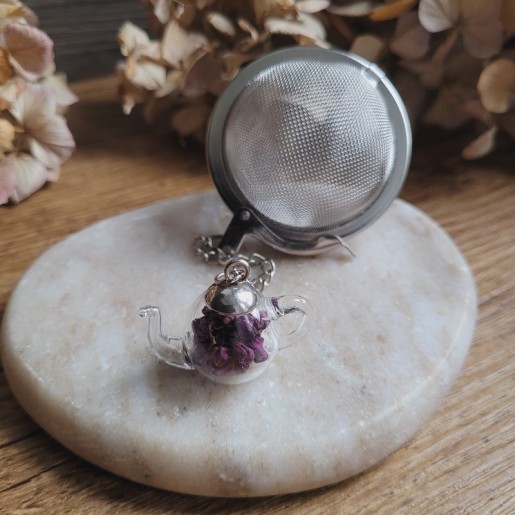Savourez votre thé avec élégance grâce à notre boule à thé en acier inoxydable ornée d'un pendentif théière unique et fleurs séchées d'Immortelle.