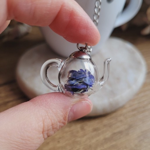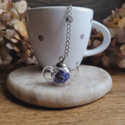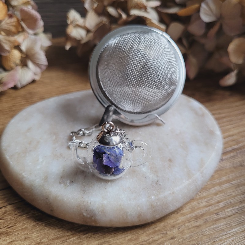 Savourez votre thé avec élégance grâce à notre boule à thé en acier inoxydable ornée d'un pendentif théière unique et fleurs séchées d'Immortelle.
