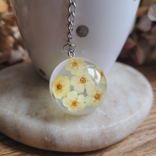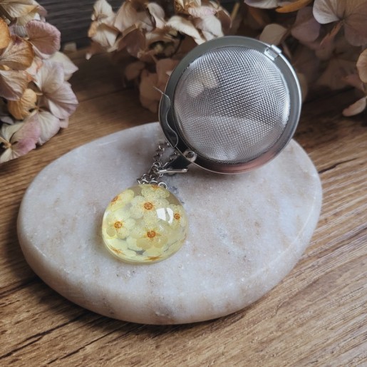 Savourez votre thé avec élégance grâce à notre boule à thé en acier inoxydable ornée d'un pendentif demi-sphère unique et fleurs séchées de Spirée.