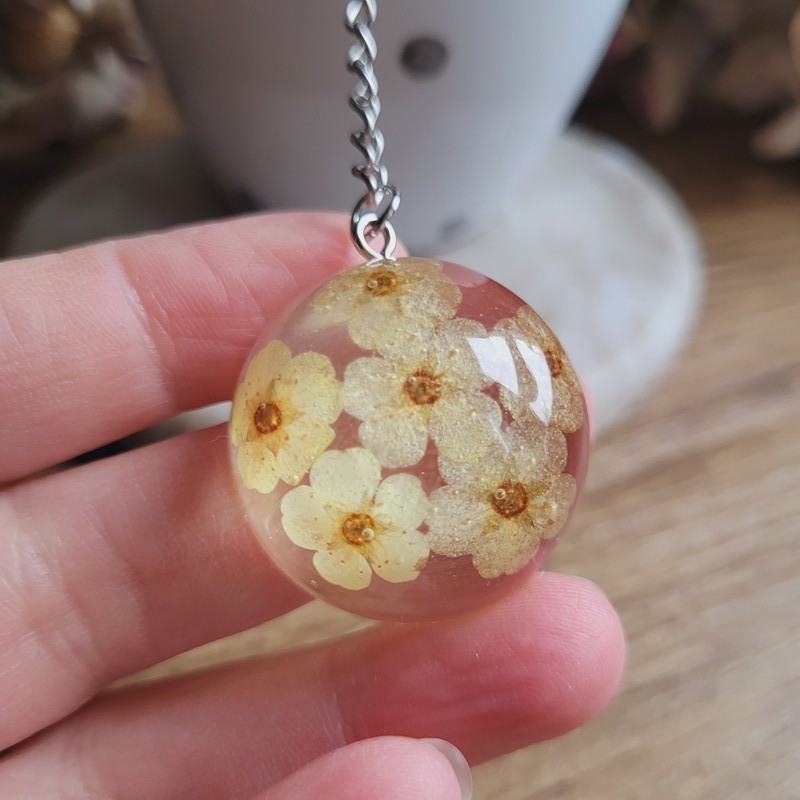 Savourez votre thé avec élégance grâce à cette boule à thé en acier inoxydable ornée d'un pendentif demi-sphère unique et fleurs séchées de Spirée.