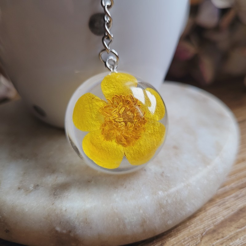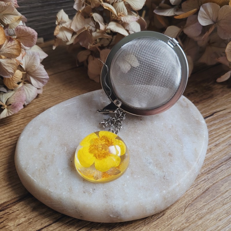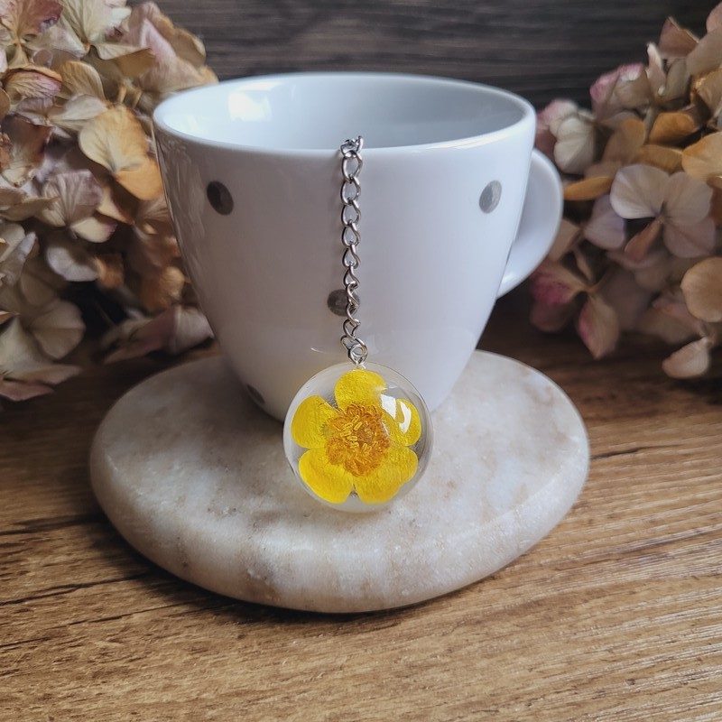 Savourez votre thé avec élégance grâce à cette boule à thé en acier inoxydable ornée d'un pendentif demi-sphère unique et fleur séchée de Bouton d'Or.