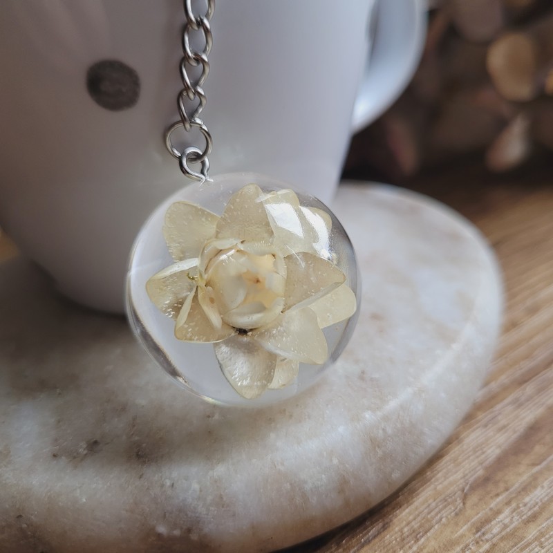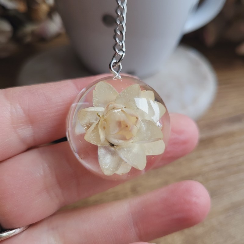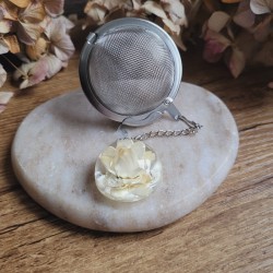 Savourez votre thé avec élégance grâce à cette boule à thé en acier inoxydable ornée d'un pendentif demi-sphère unique et fleur séchée d'Immortelle blanche.