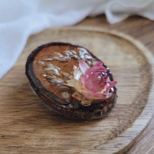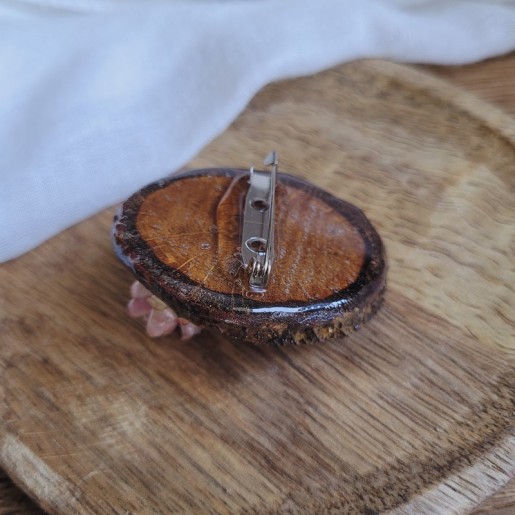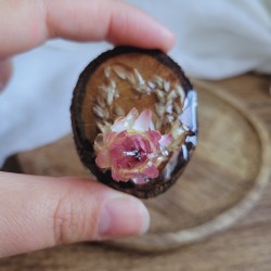 Fabriquée à partir de bois de récupération et ornée de véritables fleurs séchées cultivées et récoltées par mes soins, cette broche apporte une touche bohème et raffinée à vos vêtements, sacs ou accessoires.