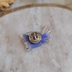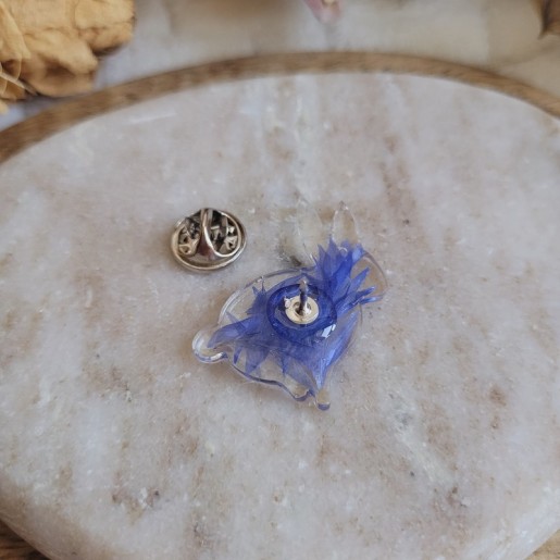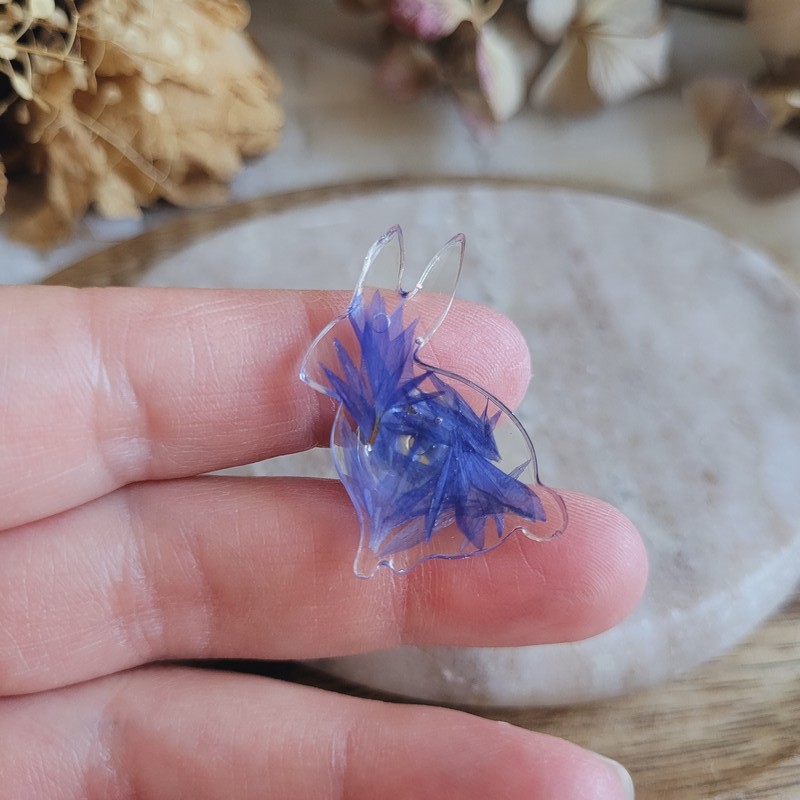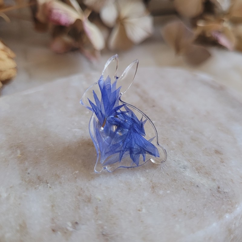 Apportez une touche poétique et printanière à votre tenue avec ce pin’s / broche lapin en résine orné de fleurs séchées naturelles de Bleuet.