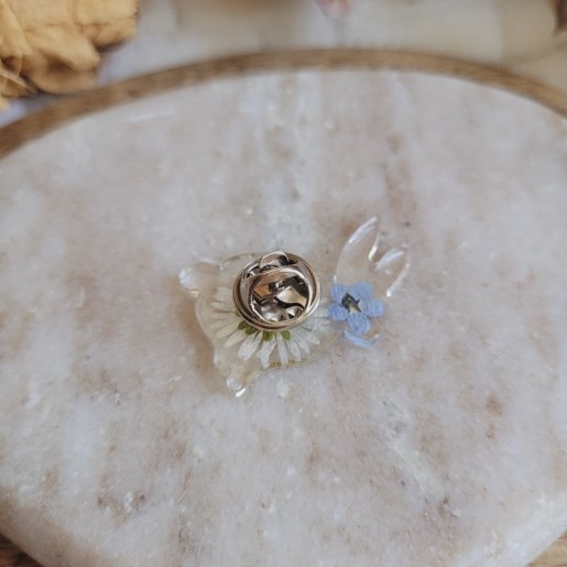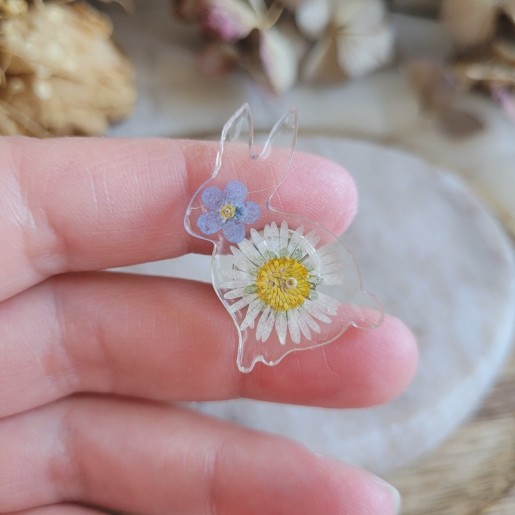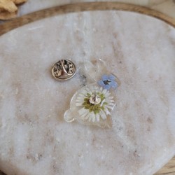 Apportez une touche poétique et printanière à votre tenue avec ce pin’s / broche lapin en résine orné de fleurs séchées naturelles de Myosotis et Pâquerette.