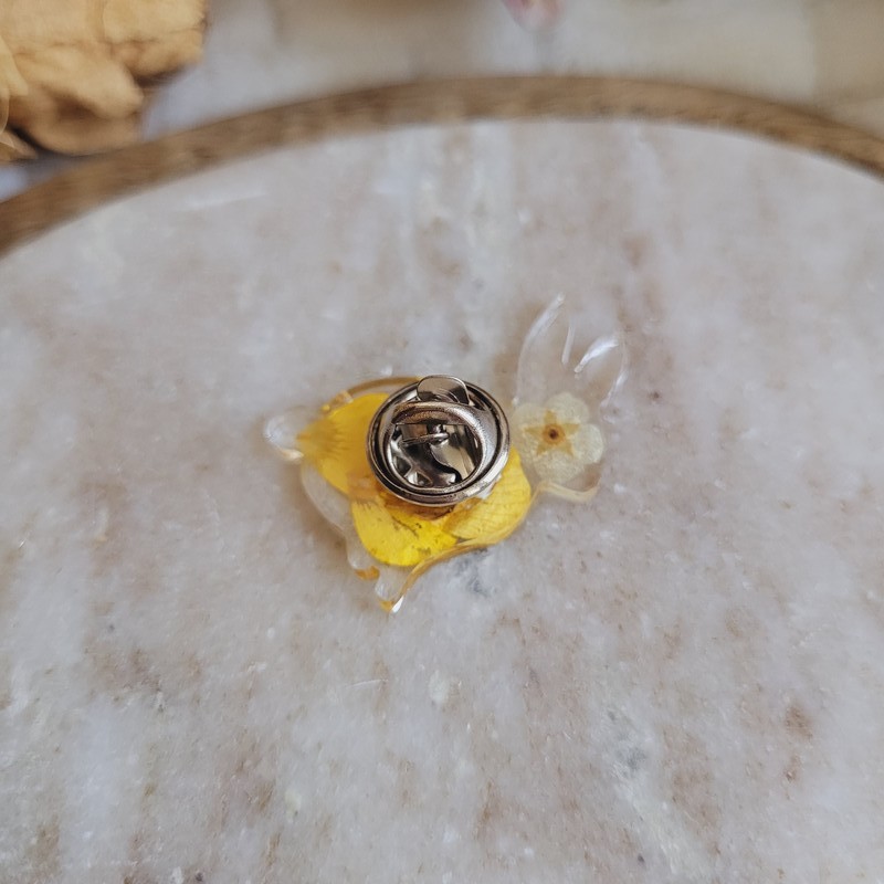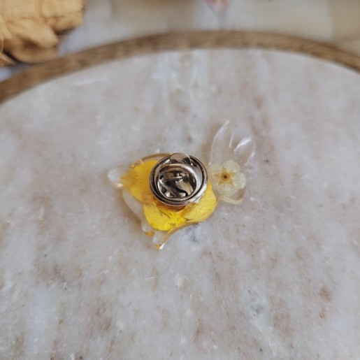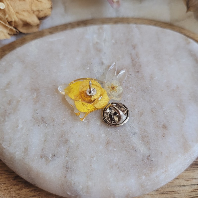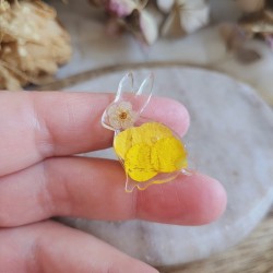 Apportez une touche poétique et printanière à votre tenue avec ce pin’s / broche lapin en résine orné de fleurs séchées naturelles de Spirée et Bouton d'Or.