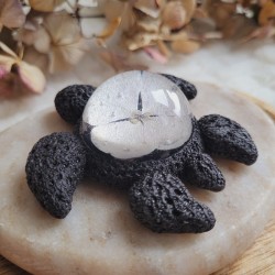 Son corps présente un aspect opaque riche en détails, tandis que sa sphère révèle une transparence cristalline mettant en valeur une fleur séchée d'Hortensia, soigneusement cultivée dans mon jardin puis séchée artisanalement par mes soins.