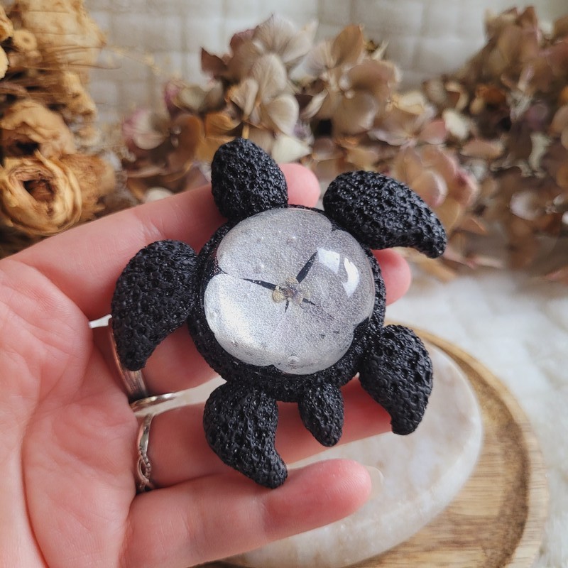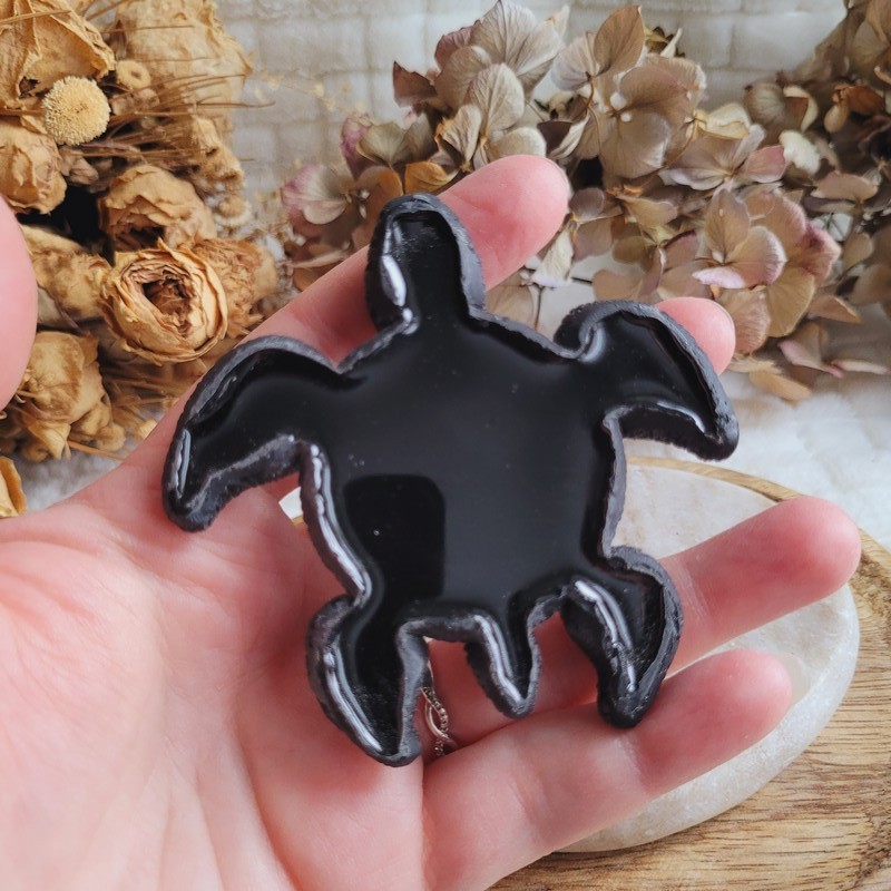 • Figurine tortue artisanale en résine transparente et noire, réalisée en un seul bloc