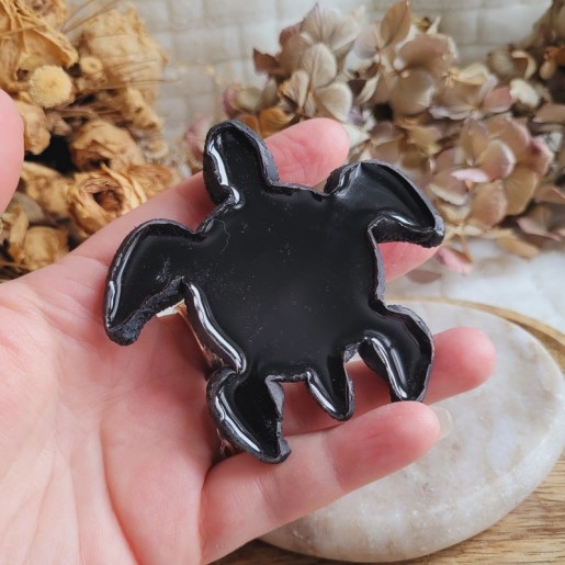• Figurine tortue artisanale en résine transparente et noire, réalisée en un seul bloc