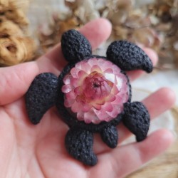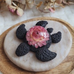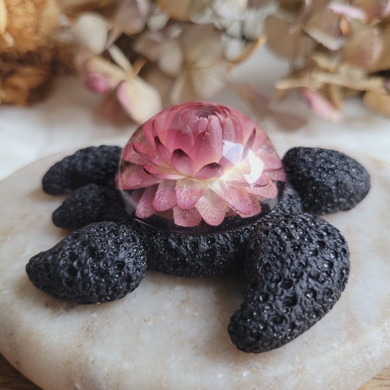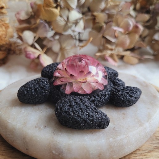 SIXTINE – Figurine Tortue en Résine avec Fleur Séchée d'Immortelle rose.
