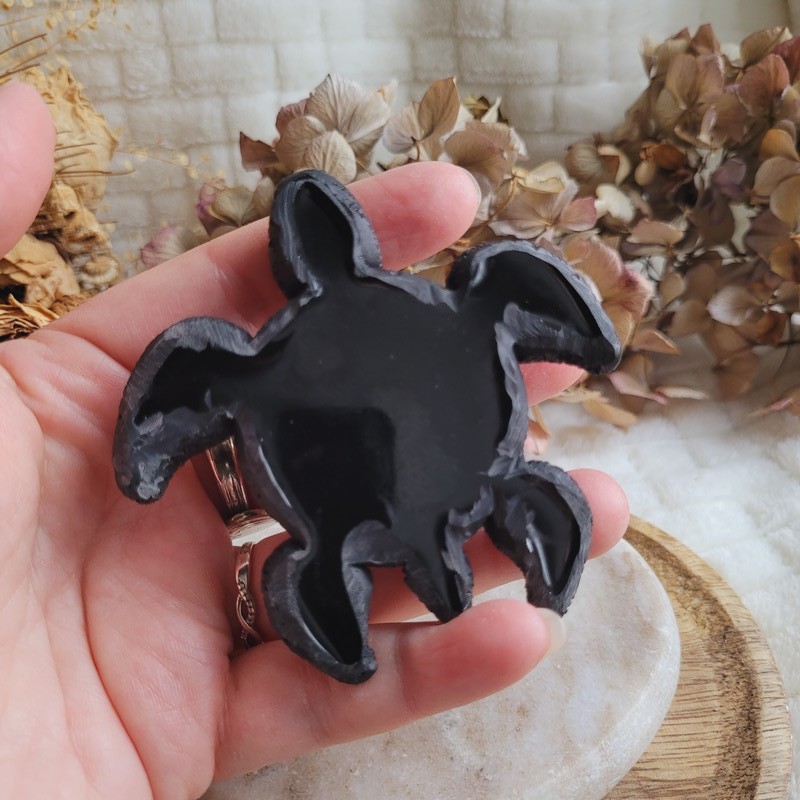 • Figurine tortue artisanale en résine transparente et noire, réalisée en un seul bloc