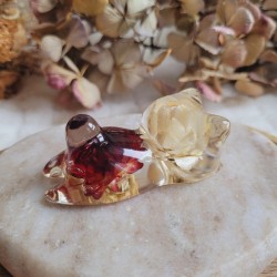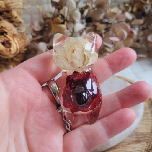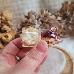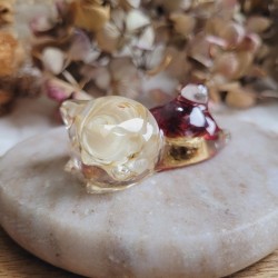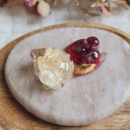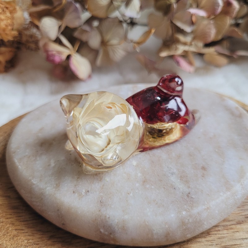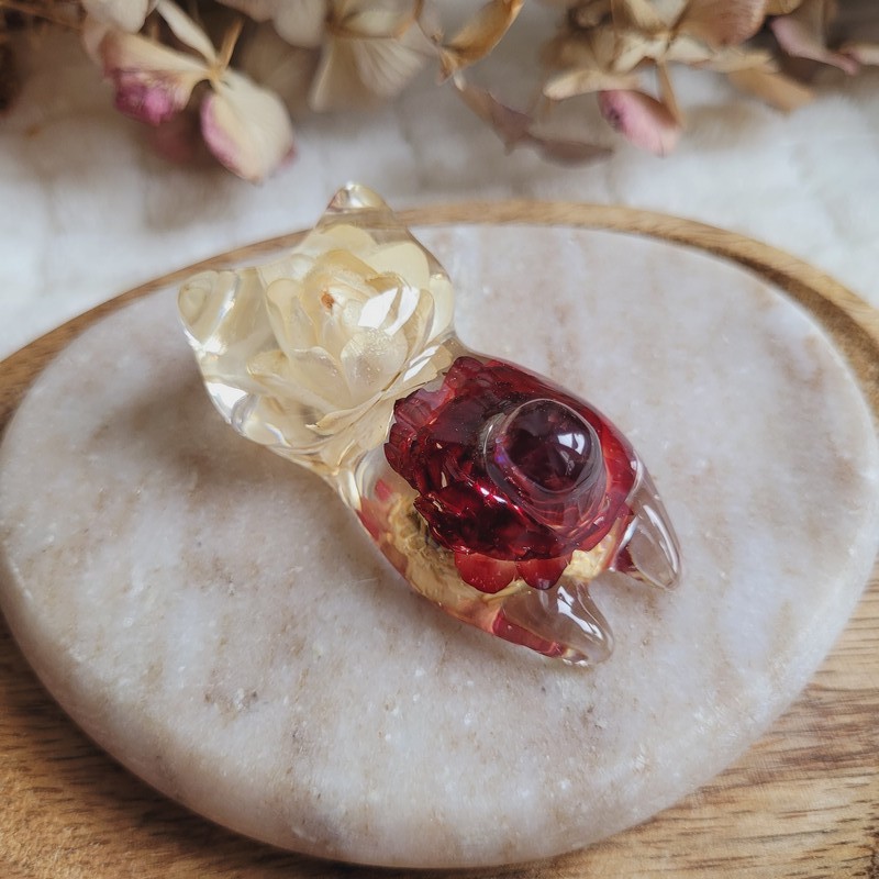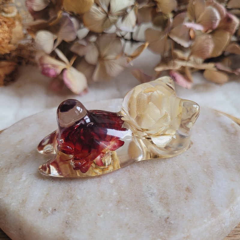 Entièrement réalisée en résine transparente, FREYJA renferme de véritables fleurs séchées d’Immortelle rouge et blanche, cultivées dans mon jardin puis séchées artisanalement par mes soins. La transparence de la résine sublime les fleurs et apporte une touche de douceur et de lumière à votre intérieur.