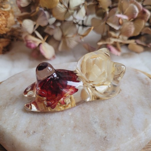 Les fleurs d’Immortelle symbolisent l’éternité, la résilience et l’amour durable, renforçant le caractère intemporel et précieux de cette figurine.