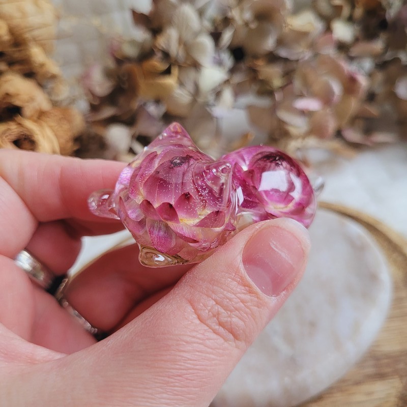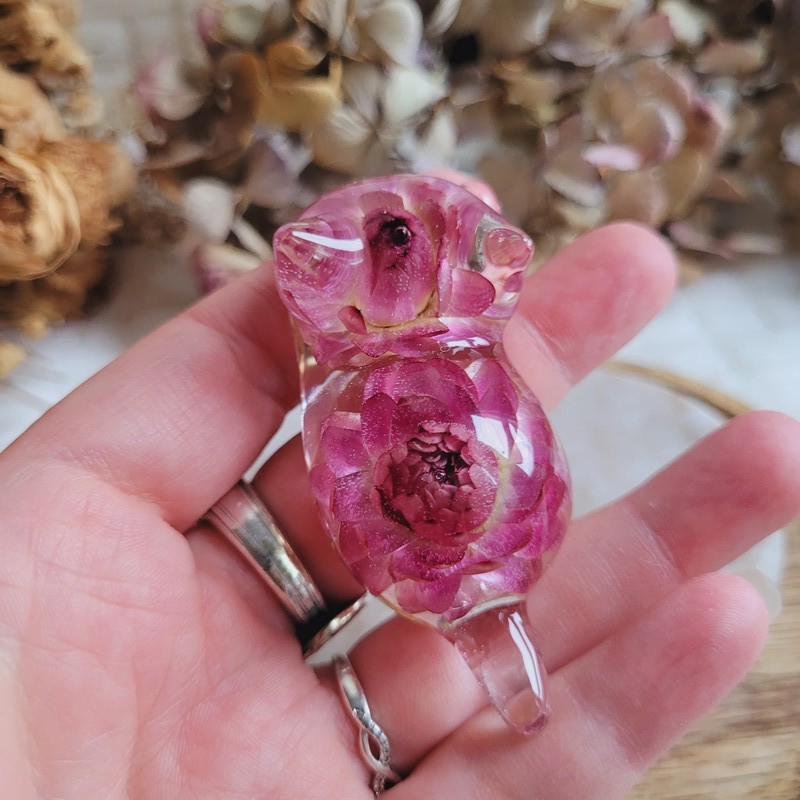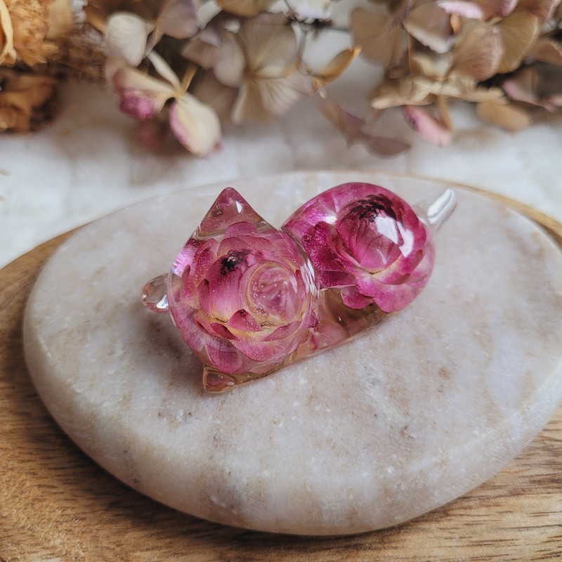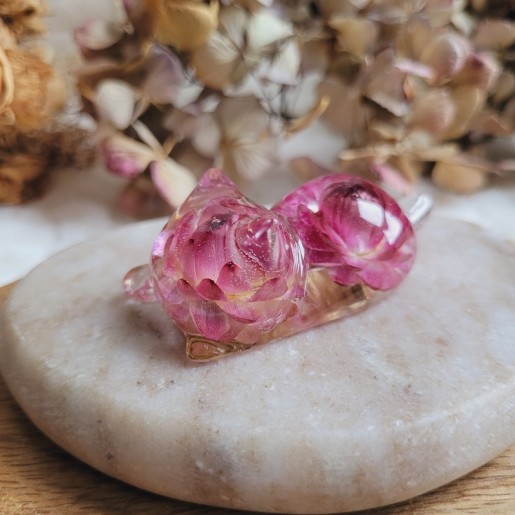 Entièrement réalisée en résine transparente, PIXELLE renferme de véritables fleurs séchées d’Immortelle roses, cultivées dans mon jardin puis séchées artisanalement par mes soins. La transparence de la résine sublime les fleurs et apporte une touche de douceur et de lumière à votre intérieur.
