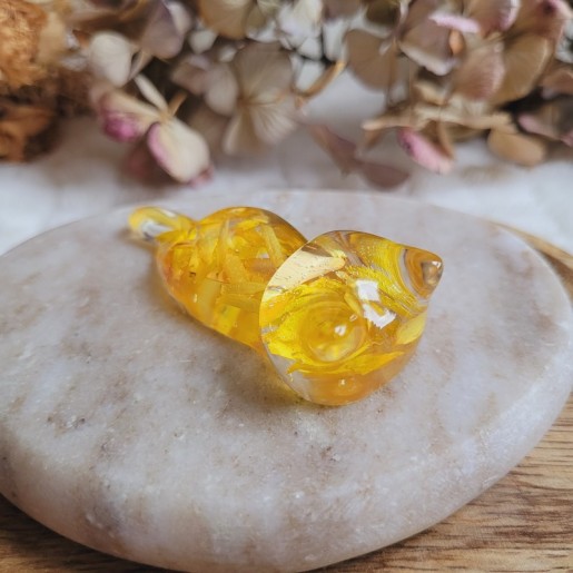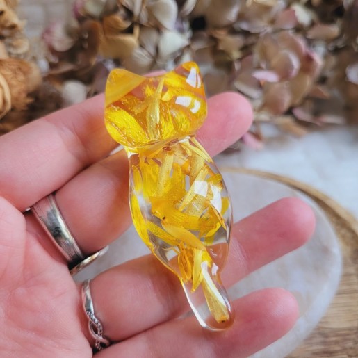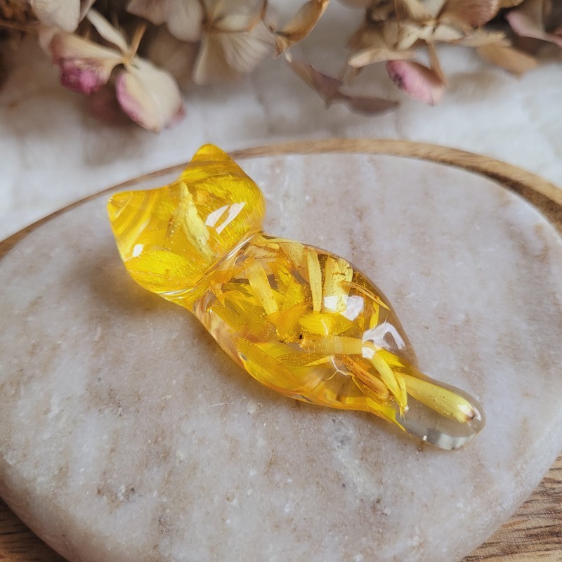 Entièrement réalisée en résine transparente, YOKO renferme de véritables fleurs séchées de pétales d'Immortelle jaune, cultivées dans mon jardin puis séchées artisanalement par mes soins. La transparence de la résine sublime les fleurs et apporte une touche de douceur et de lumière à votre intérieur.
