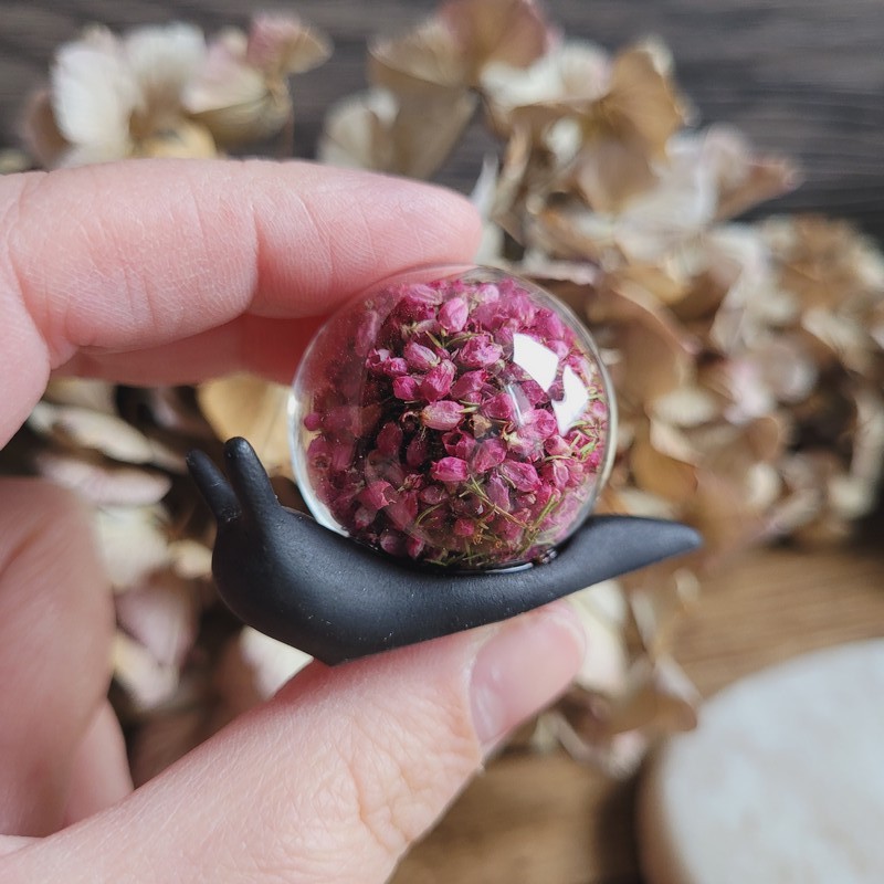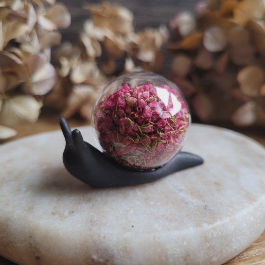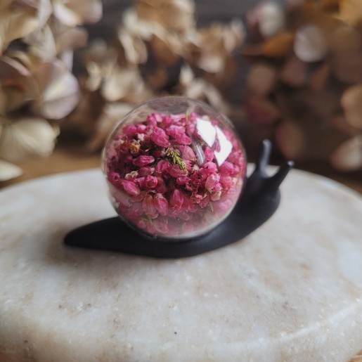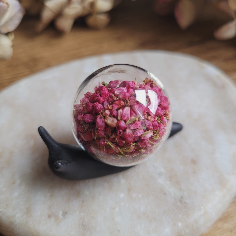 ALIÉNOR – Petit escargot décoratif en résine avec inclusion de fleurs séchées.