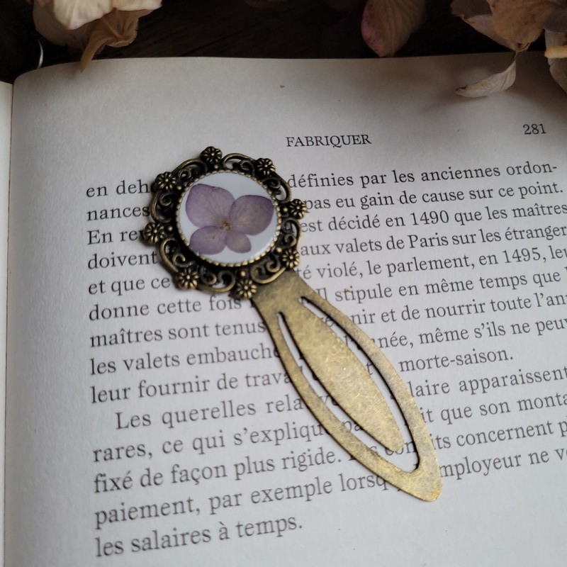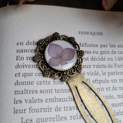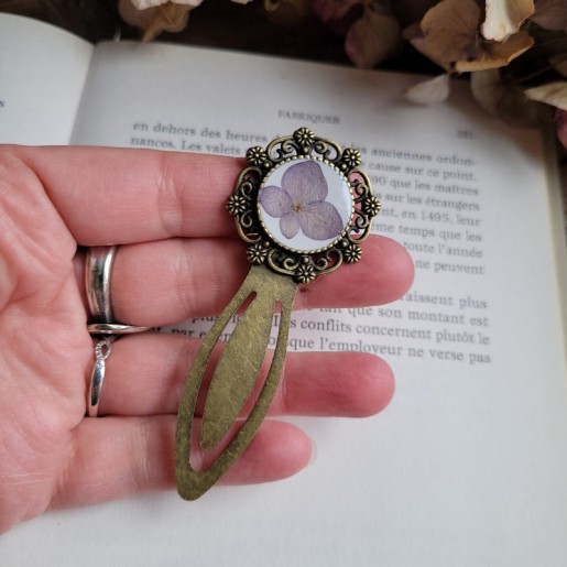 Offrez à vos lectures une touche de poésie grâce à ce marque-page en laiton délicatement orné d'une fleur séchée d'Hortensia.