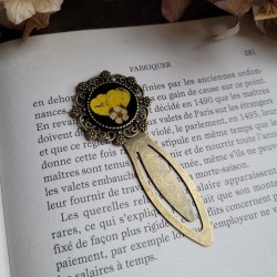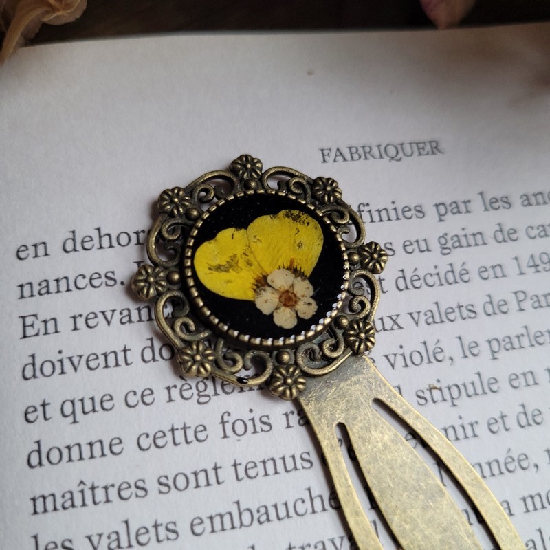 Offrez à vos lectures une touche de poésie grâce à ce marque-page en laiton délicatement orné d'une fleur séchée de Spirée et de Bouton d'Or.